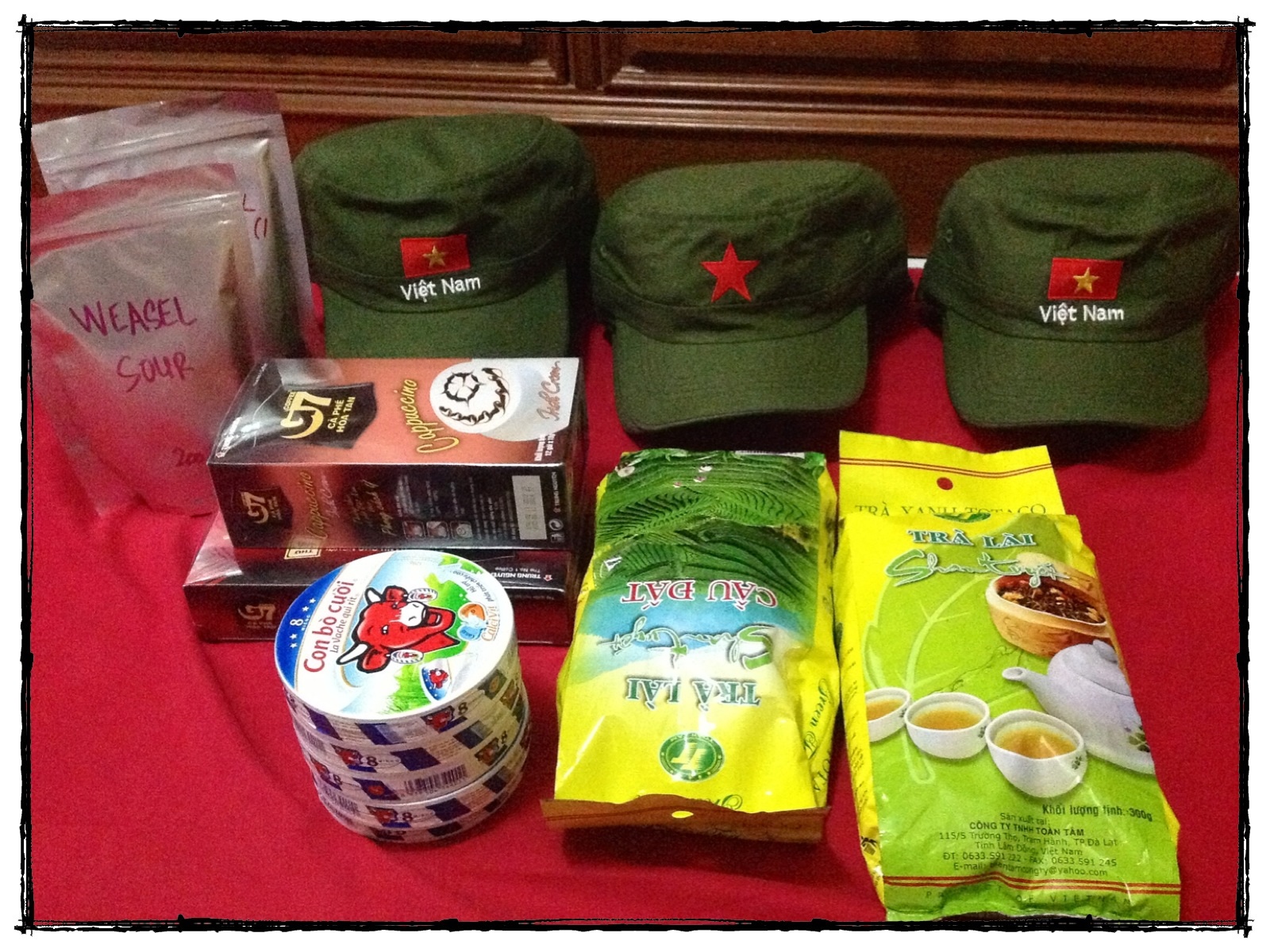 ตราวัวมาฝากลูกสาวข้างบ้านและหลานตัวเองอีก 5 อัน /ได้ชาแห้งมาฝากเจ้านาย 2 ห่อ/กาแฟยอดฮิตฝากเพื่อน 2 กล่อง