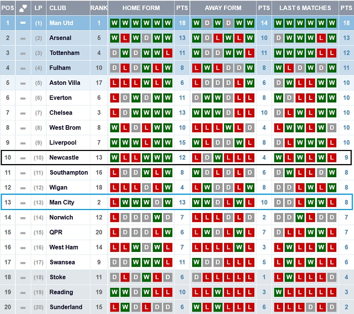ตารางคะแนนเปรียบเทียบฟอร์ม 6 นัดล่าสุดของทุกทีมในพรีเมียร์ลีก