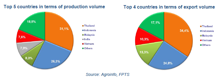 ประเทศไทยเป็นผู้ผลิตรายใหญ่อันดับที่1 (3.55 ล้านตัน) และเป็นผู้ส่งออก