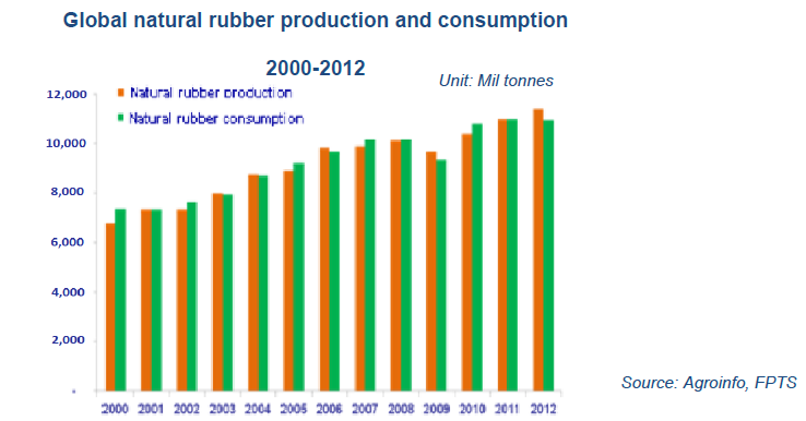 จากข้อมูลข้างต้น ปี2012 ปริมาณยางพาราทั่วโลกประมาณ 11.4 ล้านตัน