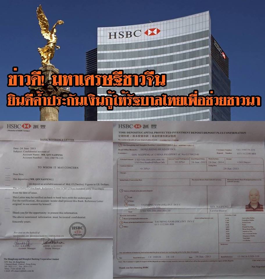 มหาเศรษฐีชาวจีนแสดงเจตจำนงค์ผ่านตัวแทนในประเทศไทย ซึ่งมีเงินฝากในธนาคารฮ่องกงเซียงไฮ้ (HSBC) สำนักงานใหญ่ ถนนควีนส์ เซ็นทรัล ฮ่องกง จำนวน 5 แสนล้านดอลลาร์สหรัฐ ( 15 ล้านล้านบาท) ยินดีค้ำประกันเงินกู้ให้รัฐบาลเพื่อสนับสนุนโครงการจำนำข้าว ช่วยเหลือชาวนาไทยทันทีหากมีความต้องการ