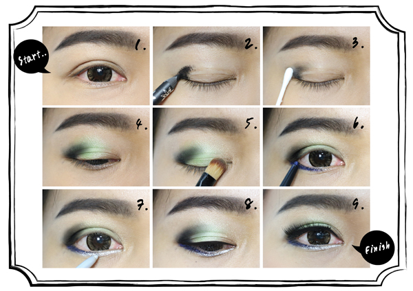 แต่งตาลุคนี้ อยากให้เปรี้ยวแต่อยากได้สีสันนิดให้ตาดูมีเสน่ห์ บังเอิญนางแบบปลายผมเป็นสีเขียว ก็เลยได้แรงบันดาลใจของการแต่งตาเลยค่ะ ใช้โทนเขียว น้ำเงิน ดำ สโมคกี้อายเบาที่หางตาด้วยสีดำ ให้ตาดูกลมโตมากขึ้น ของที่ใช้ Step ต่างๆ อยู่ที่ภาพด้านล่างเลยค่าา