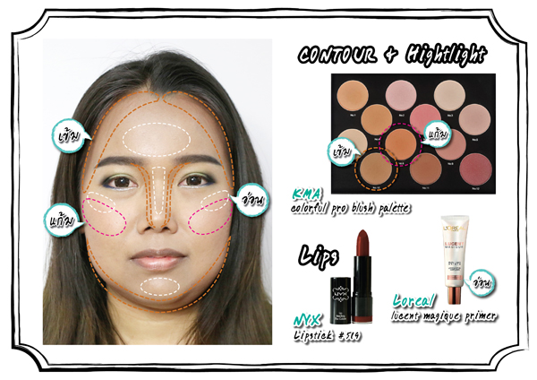 รายละเอียด ตำแหน่งในการปัดตามรูปเลยค่ะ นางแบบมีแก้มมากเก็บ contour ข้างแก้ม เหนียง และอย่าลืมบริเวณไรผมโคนผมด้านบน เพื่อช่วยให้นางแบบหัวไม่เถิกจนเกินไปจร้า ทาลิปสีแดงเข้ม เริ่ดๆ เปรี้ยวจี๊ดแน่นอนฮะ ไปดูการแปลงโฉมเป็นนางฟ้าสุดแซ่บ กันดีกว่า.....