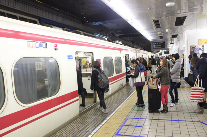 รถไฟเอกชนสาย Meitetsu ของที่นี่เวลาไปยืนรอให้สังเกตุสีที่พื้นด้วยนะครับ ให้ตรวจสอบว่าสถานที่ปลายทางเราอยู่สีไหนแล้วก็ไปยืนรอที่สีนั้นครับ เดี๊ยวตอนรถไฟมาจอด ประตูเข้าจะตรงกับสีนั้นๆพอดี