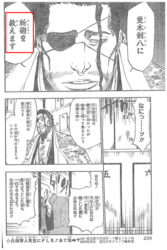 เข้าใจว่าตรงนี้ผู้แปลอาจตีความผิดไป หรือไม่ก็ไม่เคยอ่าน Bleach official Guidebook แฮะ เพราะคำว่า 斬術 มันแปลกล้อมแกล้มว่า "ศาสตร์แห่งการฆ่า" ได้เหมือนกัน แต่ตรงนี้ผมว่าถ้าแปลเป็นวิชาดาบจะเชื่อมกับประโยคหลังจากนี้ที่พูดถึงตอนที่ปู่ยามะสอนวิชาดาบให้ลุงเค็นมากกว่าแฮะ