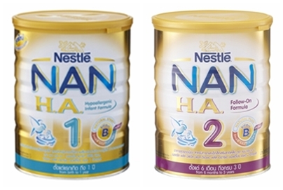 ขายนมผงเด็ก NAN HA ทั้ง 2 สูตร เหมาะสำหรับเด็กทารกแรกเกิดถึงหนี่งปี ที่มีภาวะเสี่ยงต่อการเป็นภูมิแพ้ มีส่วนประกอบของโปรตีนเวย์ 100% ที่ผ่านการย่อยโดยเอนไซม์และความร้อน ทำให้ได้โปรตีนที่มีโมเลกุลเล็กและลดสารก่อภูมิแพ้ ใช้จุลินทรีย์บิฟิดัส แล็กทัส ใช้ไขมันพืช 100% มีดีเอขเออาร์เอ นิวคลีโอไทด์ กรดไขมันจำเป็น (โอเมก้า 3 และโอเมก้า 6 )ในสัดส่วนที่เหมาะสม มีซิลีเนียม สังกะสี ธาตุเหล็ก ทอรีน และโคลีน