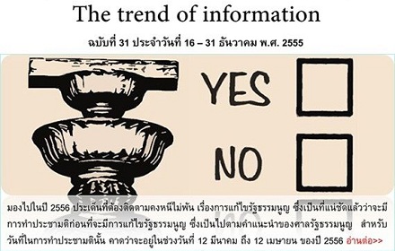 เครือข่ายข้อมูลการเมืองไทย (Thailand Political Database : TPD) ได้ออกบทวิเคราะห์เกี่ยวกับการเมืองไทยในปี 2556 ว่า ประเด็นที่ต้องติดตามหนีไม่พ้นเรื่องการแก้ไขรัฐธรรมนูญ ซึ่งเป็นที่แน่ชัดแล้วว่าจะมีการทำประชามติก่อนที่จะมีการแก้ไขรัฐธรรมนูญ ซึ่งเป็นไปตามคำแนะนำของศาลรัฐธรรมนูญ โดยช่วงเวลาในการทำประชามติน่าจะอยู่ระหว่างวันที่ 12 มีนาคม-12 เมษายน ของปี 2556 ซึ่งตามหลักเกณฑ์ในการทำประชามติ จะต้องมีการออกมาใช้สิทธิไมต่ำกว่าครึ่งของผู้มีสิทธิเลือกตั้งทั้งหมด หมายความว่า ถ้าผู้มีสิทธิเลือกตั้งทั้งหมดมี 46 ล้านคน จะต้องมีผู้ออกมาใช้สิทธิไม่ต่ำกว่า 23 ล้านคน ซึ่งเป็น งานหิน ของพรรคร่วมรัฐบาลทุกพรรค ในภาวะการที่พรรคประชาธิปัตย์ (ปชป.) ประกาศให้ผู้สนับสนุนไม่เข้าร่วมทำประชามติ