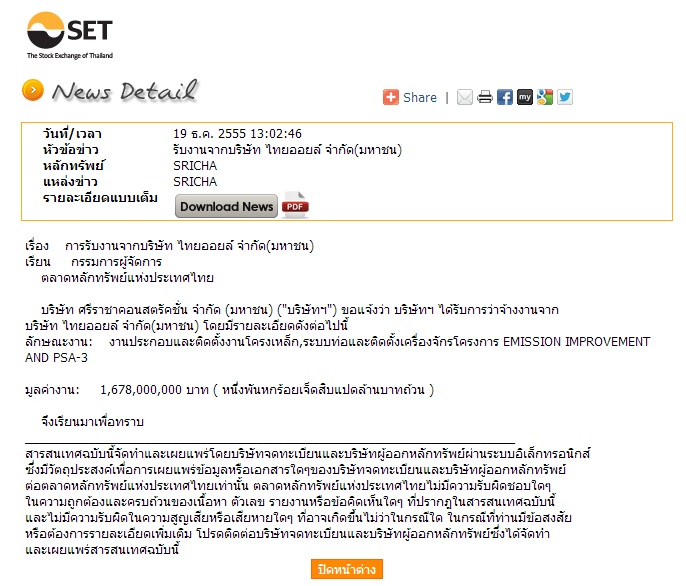 http://www.set.or.th/set/newsdetails.do;jsessionid=5B4D294ECB5E978561BE44B696B820A3?headline=%C3%D1%BA%A7%D2%B9%A8%D2%A1%BA%C3%D4%C9%D1%B7+%E4%B7%C2%CD%CD%C2%C5%EC+%A8%D3%A1%D1%B4%28%C1%CB%D2%AA%B9%29&time=1355896966000&source=SRICHA&symbol=SRICHA&pdf=dat%2Fprsnews%2Fnews%2F1094NWS191220121302470007T.pdf&filename=dat%2Fprsnews%2Fnews%2F1094NWS191220121302470007T.txt&type=R&language=th&country=TH