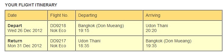 ขายตั๋ว ไป-กลับนกแอร์ กทม.-อุดร ราคา 2900 บาท เดินทาง 26-31 ธันวาคม 2555