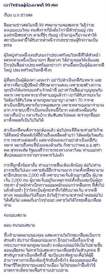 มาร์คครับ มีคนเอาใจช่วยคุณ ประชาชนเขียนจดหมายถึงข่าวสดครับ บอกว่าขอเอาใจช่วยคุณในเรื่องคดี 99 ศพ