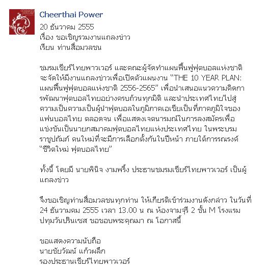 Cheerthai Power ประกาศเจตนารมณ์ในการลงสมัครเพื่อแข่งขันเป็นนายกสมาคมฟุตบอลไทยคนใหม่ปีหน้าครับ !!