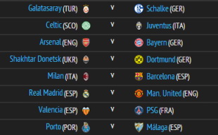 กาลาตาซาราย Vs ชาลเก้ เซลติก Vs ยูเวนตุส อาร์เซน่อล Vs บาร์เยิร์น มิวนิค ชัคเตอร์ โดเนตส์ Vs ดอร์ทมุนด์ มิลาน Vs บาเซโลน่า มาดริด Vs แมนยู บาเลนเซีย Vs ปารีส แซงแชร์กแมง ปอร์โต้ Vs มาลาก้า