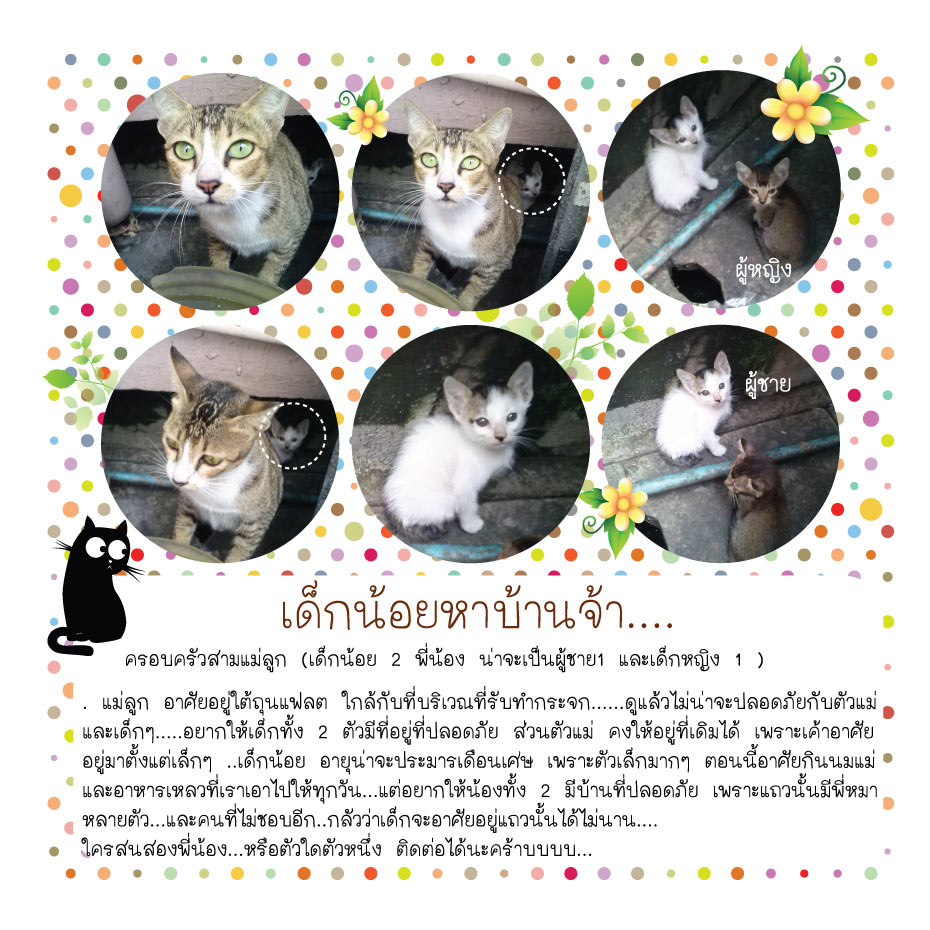 .แม่ลูก อาศัยอยู่ใต้ถุนแฟลต ใกล้กับที่บริเวณที่รับทำกระจก......ดูแล้วไม่น่าจะปลอดภัยกับตัวแม่ เพราะมีเศษกระจกที่ตัดแล้วหล่นอยู่ที่พื้นเยอะมากๆ และประกอบกับอยู่ใต้ถุนแฟลตอีก ยุงเยอะมาก เวลาเราเอาอาหารไปให้ ยุงตอมหัวเต็มเลย....