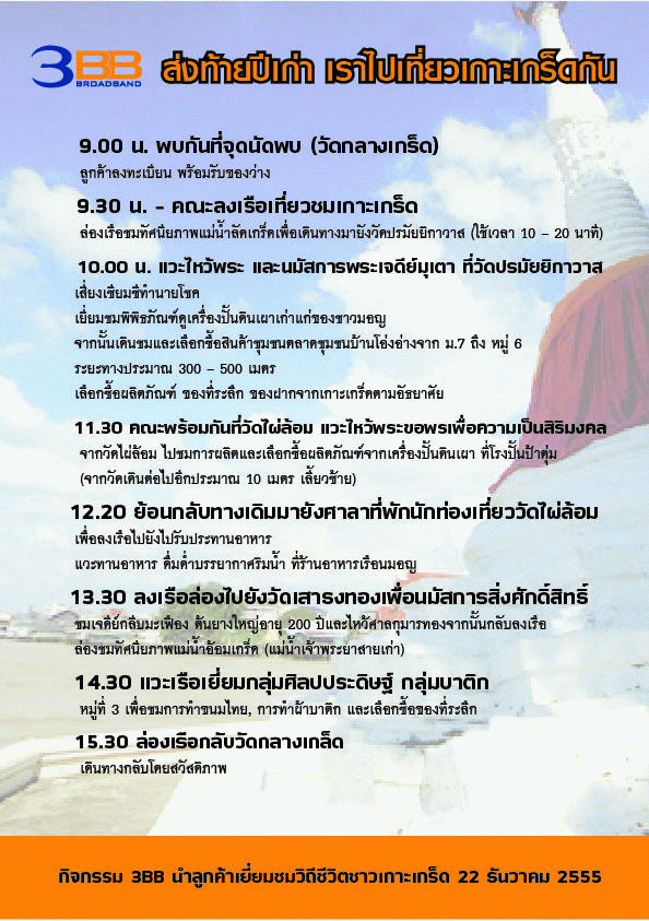 พอดีทาง 3BB จัดกิจกรรมให้กับสมาชิก และผมได้โควต้าไปเที่ยวเกาะเกร็ดฟรี 2 คน (ไปเช้าเย็นกลับ) โดยทาง 3BB จะออกค่าใช้จ่ายให้ทั้งหมด