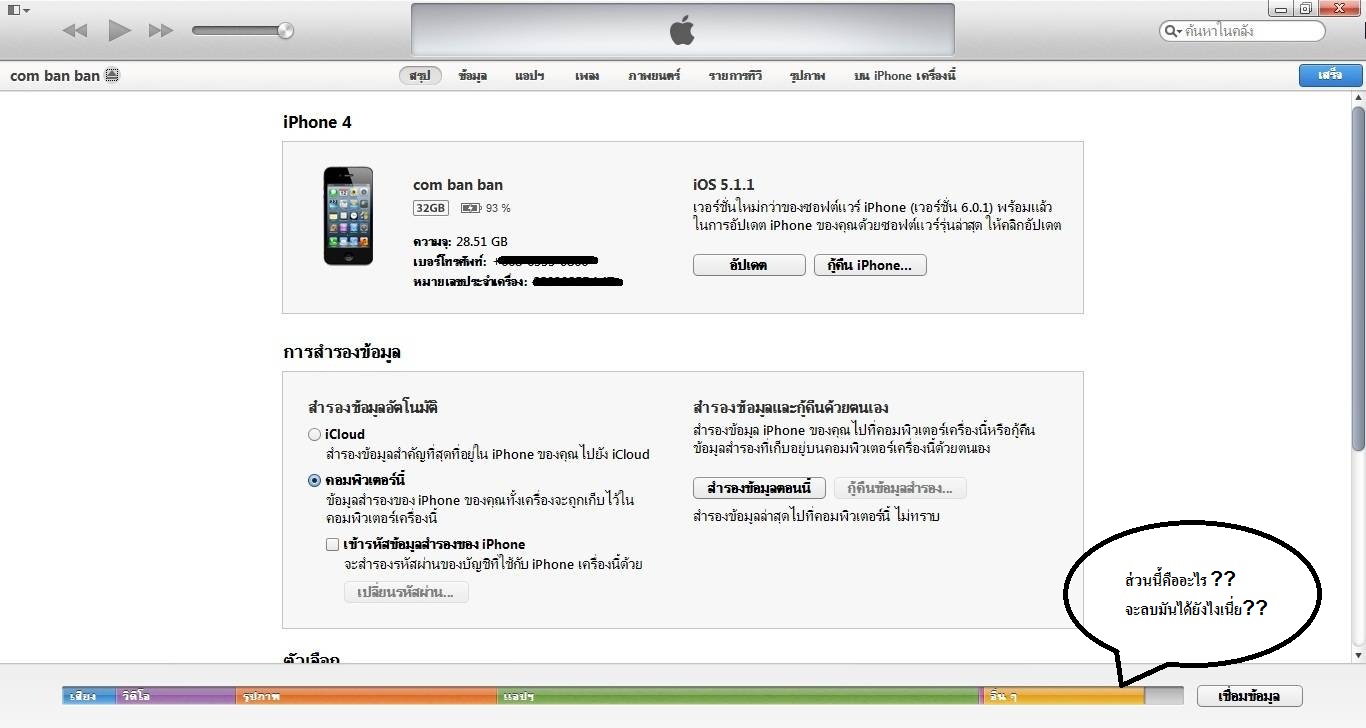 สวัสดีครับ คือ iPhone4 ผมตอนนี้มี other อยู่เกือบๆ 20 กิ๊ก (กรอบสีน้ำเงิน) ซึ่งหนึ่งในสาเหตุที่ผมพอจะทราบ มาจาก voice memo ที่ผมเคยลบไปแล้ว โดยใช้ iTools แต่พอมาดูใน iTunes ปรากฏว่าไฟล์ที่ผมเคยลบไปแล้