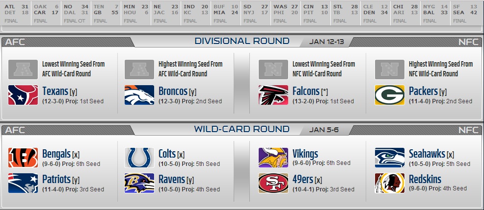 ทางฝั่งAFC ได้ทีมครบลงตัวไปหมดแล้ว แต่ทางNFC ไม่แน่ไม่นอน มี5ทีมต้องแย่งWild card ที่มีแค่2ใบกันอย่างหนัก