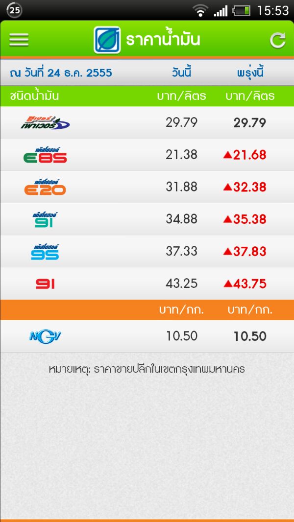 อัปเดตราคาน้ำมัน มีผลวันพรุ่งนี้ (26 ก.ย. 2561) ตั้งแต่เวลาตี 5 เป็นต้นไป น้ำมันกลุ่มเบนซิน และแก๊สโซฮอล์ทุกชนิดปรับขึ้นราคา 50 สตางค์/ลิตร ส่วนน้ำมันกลุ่มดีเซล ดีเซลพรีเมี่ยม และ E85 ปรับขึ้น 30 สต