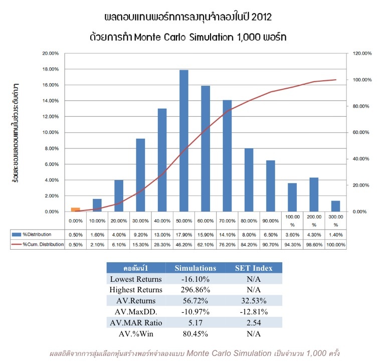 เพื่อให้เห็นภาพรวมของผลตอบแทนของนักลงทุนส่วนใหญ่นั้น ผมจะใช้วิธีการสร้างพอร์ทจำลองขึ้นมาเพื่อแทนภาพของนักลงทุนแต่ละคน โดยทำการสุ่มซื้อหุ้นในตลาดเข้ามาพอร์ทละ 10 ตัว (ซื้อตัวละ 10% ของพอร์ทต่อหุ้น) เป็นจำนวนทั้งสิ้น 1,000 ครั้ง (1,000 คน) โดยใช้กลยุทธ์ที่ง่ายที่สุดนั่นก็คือ Buy and Hold ถือแล้วไม่ขายตั้งแต่วันที่ 4/1/12 ปัจจุบัน ซึ่งมันได้ให้ผลสถิติที่น่าสนใจออกมาดังนี้