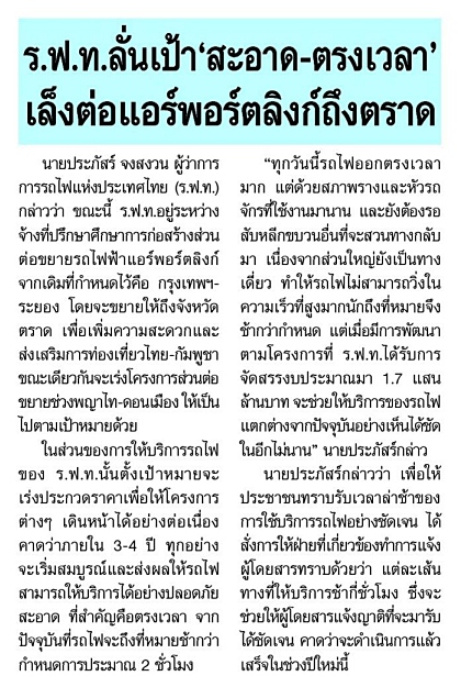 ร.ฟ.ท.ลั่นเป้า'สะอาด-ตรงเวลา'เล็งต่อแอร์พอร์ตลิงก์ถึงตราด