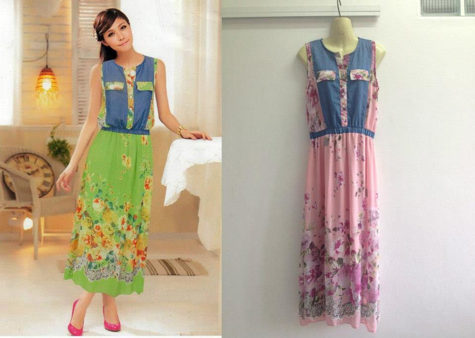 เดรสยาวลายดอกไม้สีชมพูแต่งด้วยผ้ายีนส์