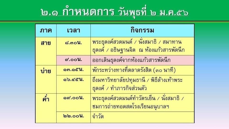 กำหนดการพระธุดงค์ วันนี้นะ 2 มกราคม พ.ศ. 2556