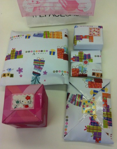 เปิดกล่องมา ตื่นเต้นมากๆเลย เพราะมีของชิ้นเล็กๆเต็มกล่องเลย ห่อด้วยกระดาษสีสันสวยงาม เห็นความตั้งใจของคนให้เลยค่ะ