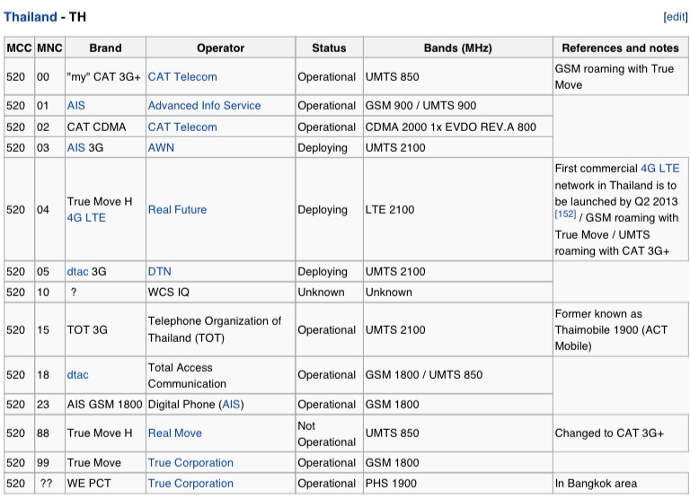 Mobile country code Thailand 520 00 my" CAT 3G 850 CAT Telecom 520 01 AIS GSM 900 Advanced Info Service 520 02 CAT CDMA 800 CAT Telecom 520 03 AIS 3G 2100 AWN 520 04 True Move H 3G/4G 2100 Real
