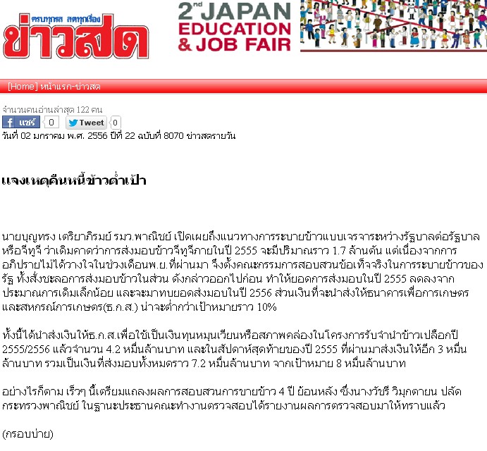 1.เรื่องส่งข้าว G to G ปี 2555 จำนวน 1.7 ล้านตันนั้น มีการบอกว่าส่งไปแล้ว 1.46 ล้านตัน ตั้งแต่เดือนกันยายนแล้ว เหลืออีกประมาณ 3 แสนตัน ส่งในสามเดือนสุดท้ายของปี แต่สุดท้ายบอกว่าส่งออกได้น้อยลง เพราะต้องชะลอการส่งออก เพื่อการตรวจสอบ อันนี้ก็คงต้องพิจารณากันดู ว่าสมเหตุสมผลหรือไม่ เพราะสัญญาก็ทำแล้ว แผนการส่งออกก็มีแล้ว และปริมาณอีกแค่เล็กน้อย ไม่เห็นต้องชะลอเลย