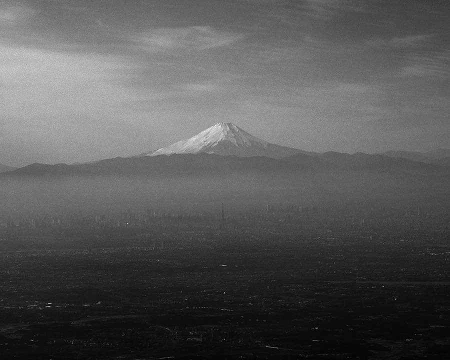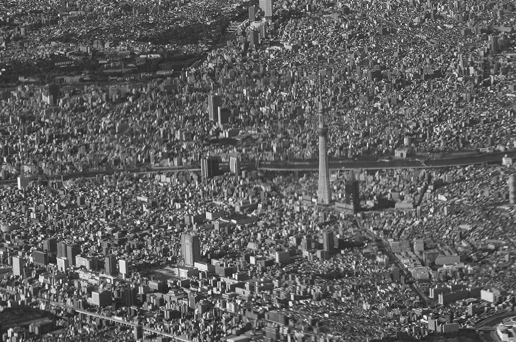 ขอสองภาพแบบขาวดำนะครับ ภาพ Tokyo จากเครื่องบิน มองเห็น Fujiyama และ Tokyo Sky Tree Tower