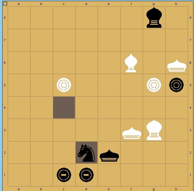 จากภาพหมากขาวเดินก่อน และเอาชนะหมากดำภายในสามทีไล่ หมายเหตุ เบี้ยหมากดำเป็นเบี้ยคว่ำทั้งหมด