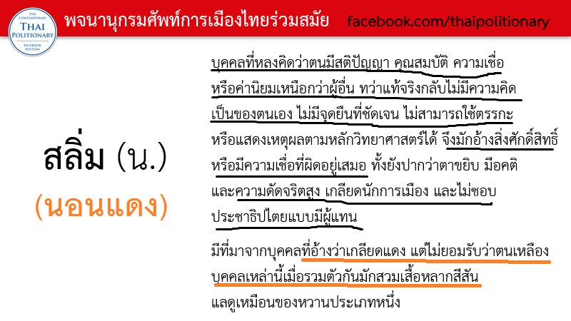 ผมคนหนึ่งอยากเห็น พวกเขาแสดงจุดยืนที่ชัดเจน อย่าบอกว่าไม่เอาแดง แต่ไม่ใช่เหลือง ไม่ใช่ฟ้า ไม่ใช่น้ำเงิน ไม่ใช่เขียว ไม่ใช่สลิ่ม แล้วมันอะไร ลองหาอะไรสักอย่าง ที่ไม่ใช่คำว่า NONแดง เพราะมันยังมีคำว่า แดง มันไม่กลืนน้ำลายตัวเองหรือไร