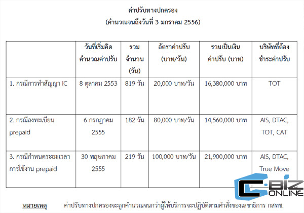 ในส่วนกรณีของทีโอทีจะต้องชำระค่าปรับให้ กสทช.วันละ 20,000 บาท โดยทีโอทีจะต้องชำระค่าปรับตั้งแต่วันที่ 8 ต.ค. 2553 หากนับจนถึงวันที่ 3 ม.ค. 2556 รวม 812 วัน คิดเป็นเงินค่าปรับ 16,380,000 บาท รวมทั้งต้องจ่ายค่าปรับไปจนกว่าทีโอทีจะชำระค่าปรับทั้งหมด