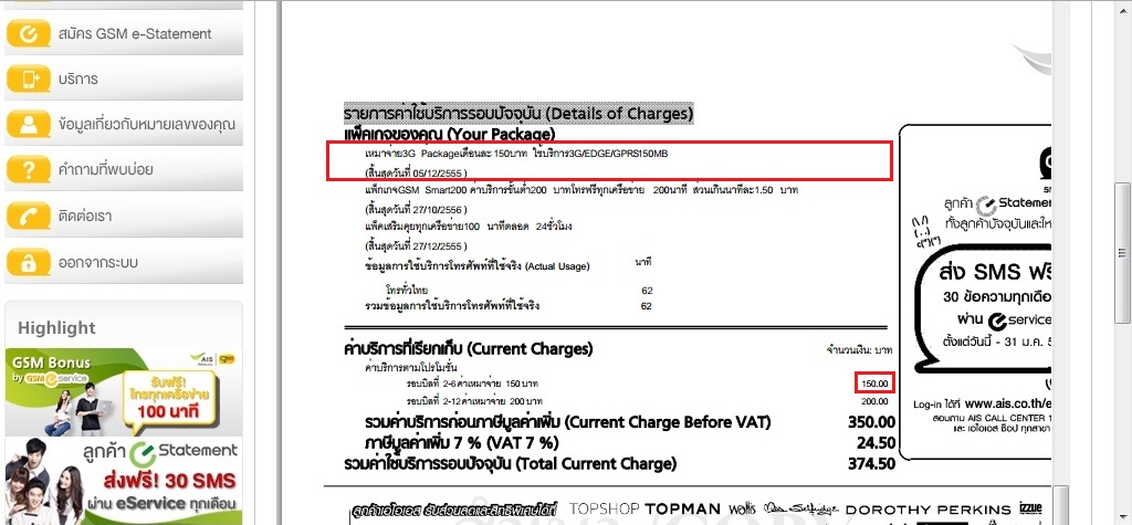 ผมอยากทราบว่า ค่าบริการลูกค้ารายเดือน นั่นมีอะไรบ้างครับ ผมใช้ แพ็คเกจ 399 ฿ ยอดการใช้งาน มีโทรนอกเครื่อข่าย 55 สตางค์ แต่ในบิล บอก 427.52฿ ผมเลยสงสัยว่ามีค่าอะไรบ้าง ผมกดดูรายละเอียดก็กดไม่ได้?!! อย