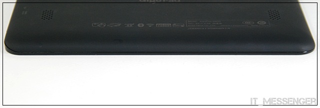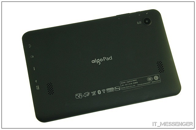 ด้านหลังของ aigoPad M80D ที่บนขวาจะเป็นที่อยู่ตำแหน่งของกล้องหลังขนาดความละเอียด 2 ล้านพิกเซล ถัดมาที่ด้านล่างสุดจะเป็นแถบแสดงสัญลักษณ์ที่รองรับการใช้งานบน aigoPad M80D เช่นเดียวกับแถบด้านซ้าย ที่มีการระบุตำแหน่งพอร์ทต่างๆ ปิดท้ายด้วยช่องลำโพงแบบสเตอริโอขนาบข้างซ้ายขวา