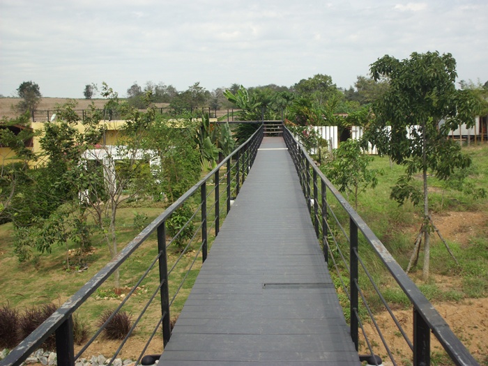 ถ้าเราขึ้นไปเดินบนสะพานจะเห็นวิวหลังตึกที่พักเป็นแบบนี้ ข้างล่างเป็นห้องพักอีกแบบนีง