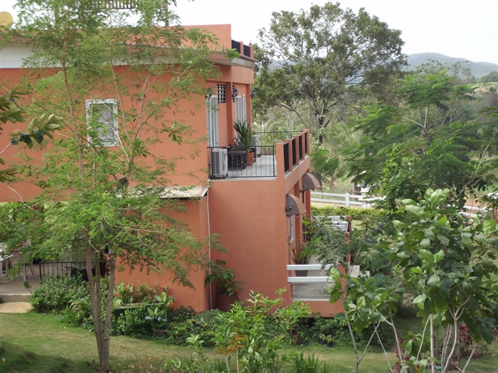 จากระเบียงหลังห้องจะมองเห็นวิวและตึกสีเหลือง เป็นล็อบบี้และทานอาหารเช้าอยู่ที่เดียวกัน