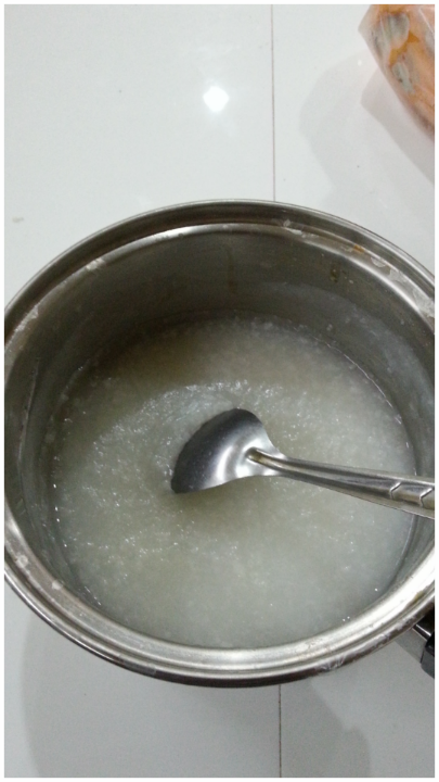 ข้าว ใช้ปลายข้าวหอมมะลิแช่น้ำ1คืน แล้วต้มจนข้าวเปื่อยไม่ต้องปรุงรส