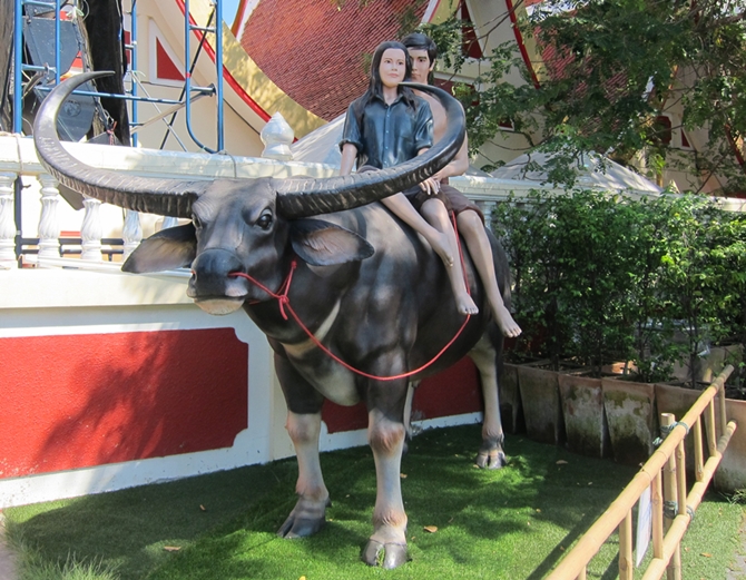 พอมาถึง จอดรถเสร็จก็เดินตากแดดหัวแดง ดุ่มๆตามชาวบ้านเค้ามา (เป็นคนพื้นที่ซะเปล่า) ก็พบรูปปั้นขวัญเรียมขี่น้องควายอยู่