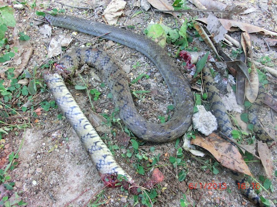 เรากลัวเกิดอันตรายต่อมะหมาเลยจำเป็นต้องจับจอบฟันฉับฉับปลิดชีวิตงูค่ะ