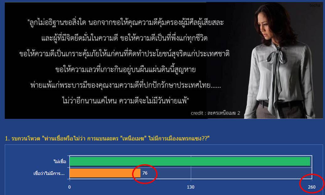 ผลการสำรวจคือ เชื่อว่าไม่มีการเมืองแทรกแซง 76 ท่าน : ไม่เชื่อ 260 ท่าน