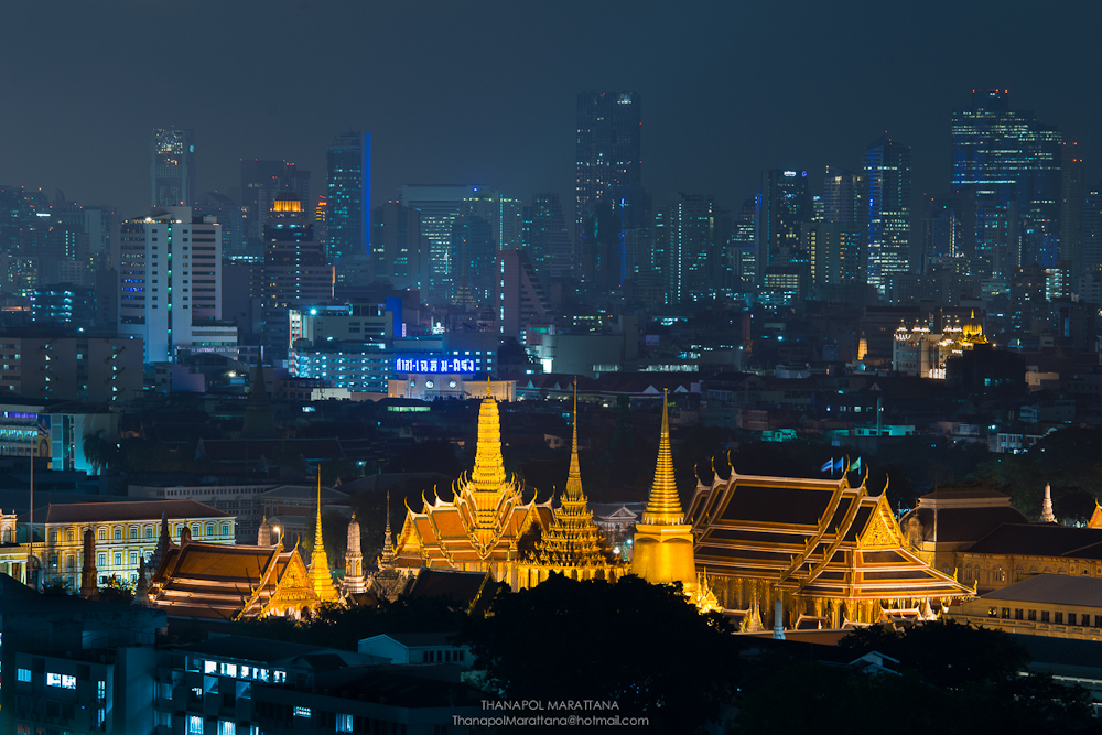 สองนคร ฉากหน้าเป็นวัดซึ่งเคยรุ่งเรืองมาก ฉากหลังเป็นตึกสะท้อนปัจจุบัน