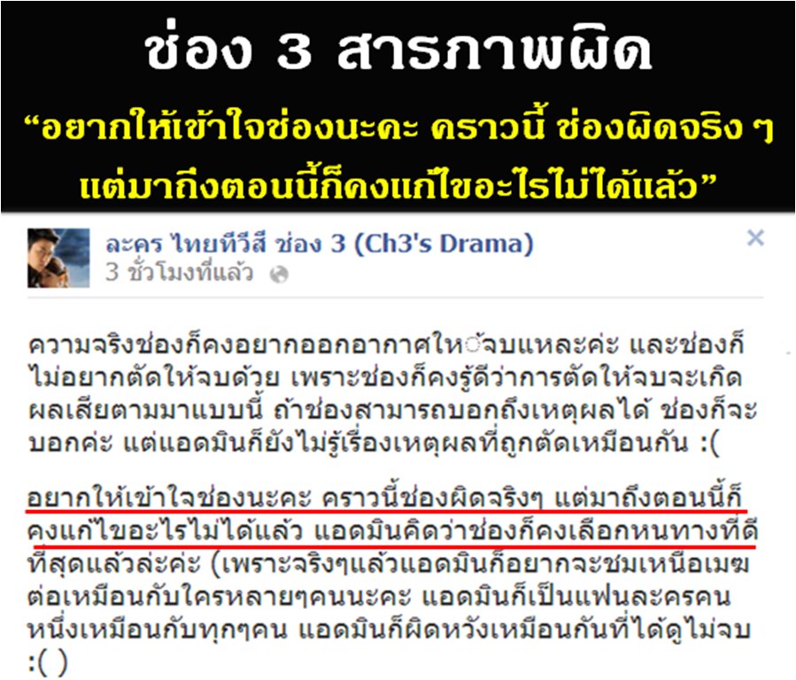 ...ถ้าละครมันแย่จริงๆ เดี๋ยวเค้าก็ด่าละครกับคนสร้างเอง และกลับมาเห็นใจช่องสาม ว่าตอนนั้นทำถูกแล้วที่ตัดจบ
