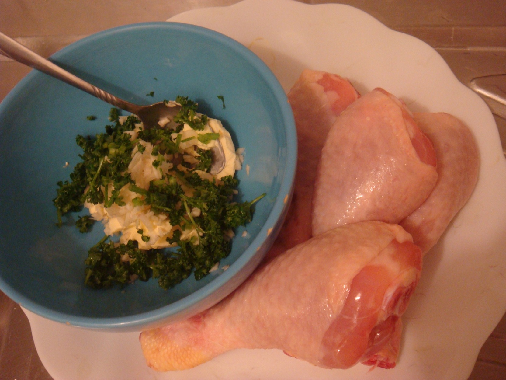 เนยก็กะๆเอา ตักใส่ถ้วยเล็กไว้ ใส่กระเทียมสับ2กีบ เรามีพาสลี่ย์สด สับใส่แล้วคนเข้าด้วยกัน