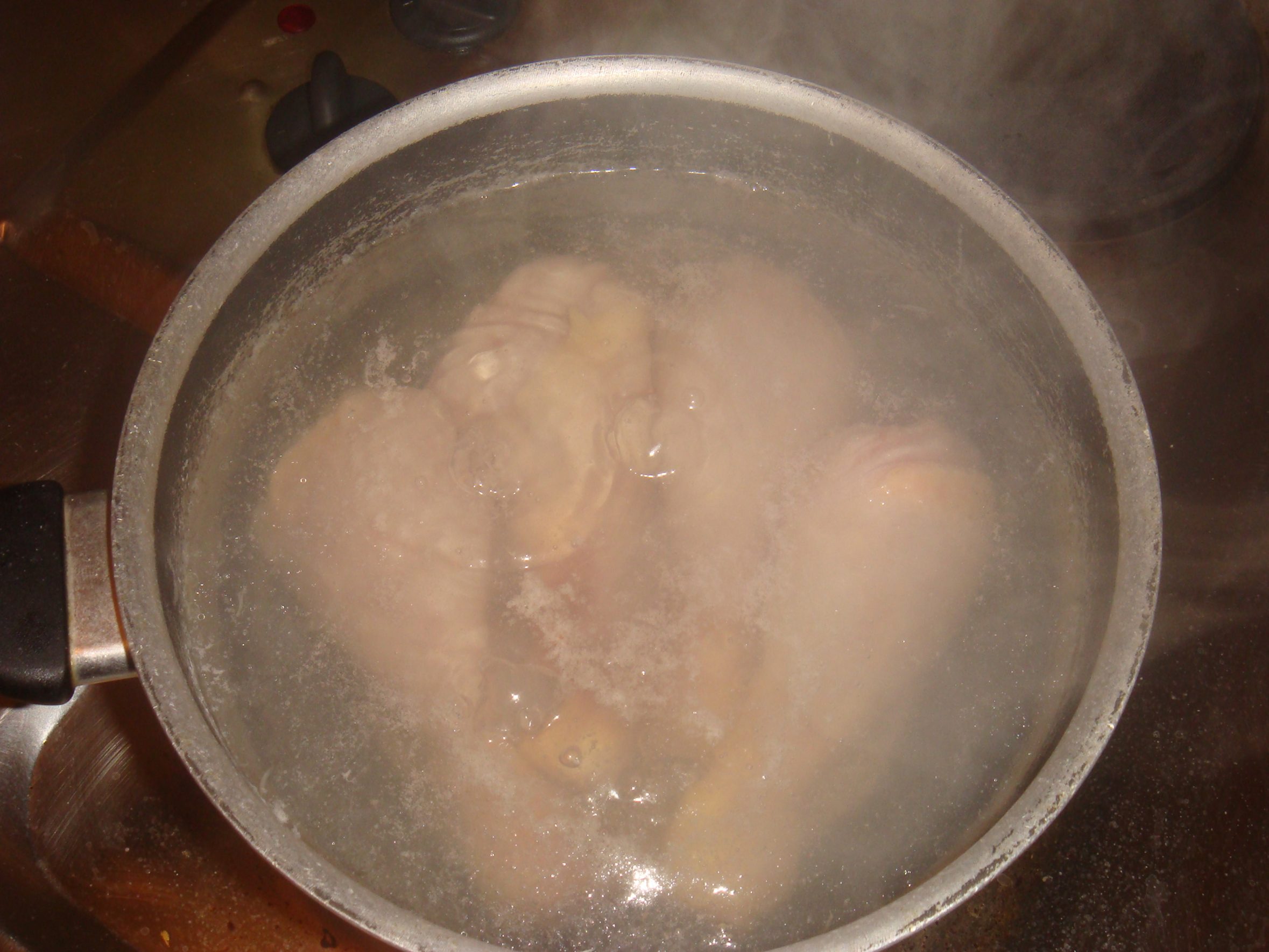 จากนั้นตั้งหม้อต้มน้ำให้เดือด ใส่เกลือนิดหน่อย แล้วหย่อนน่องไก่ลงไป ต้มประมาณ 5นาที แล้วยกออก ตักน่องพักไว้