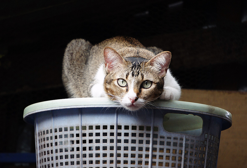 การกำจัดความรกอีกวิธีหนึ่่งคือทำให้ฉากหลังมืด หรือเรียกว่าภาพหลังดำ ภาพนี้ถ่ายเจ้าฝนบนเหล่าเต๊งหลังบ้าน เป็นที่ให้แมวขึ้นมาผึ่งแดดอีกที่หนึ่ง แต่ค่อนข้างรกรุงรัง เราดูว่าแสงมาลงที่ตัวแมวแต่ไม่ลงที่ความรกด้านหลังก็ถ่ายได้แล้วครับ