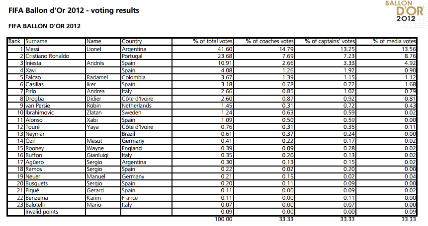 [FIFA Ballon d'Or] วิเคราะห์ผลคะแนนปี 2012 กันดีว่า