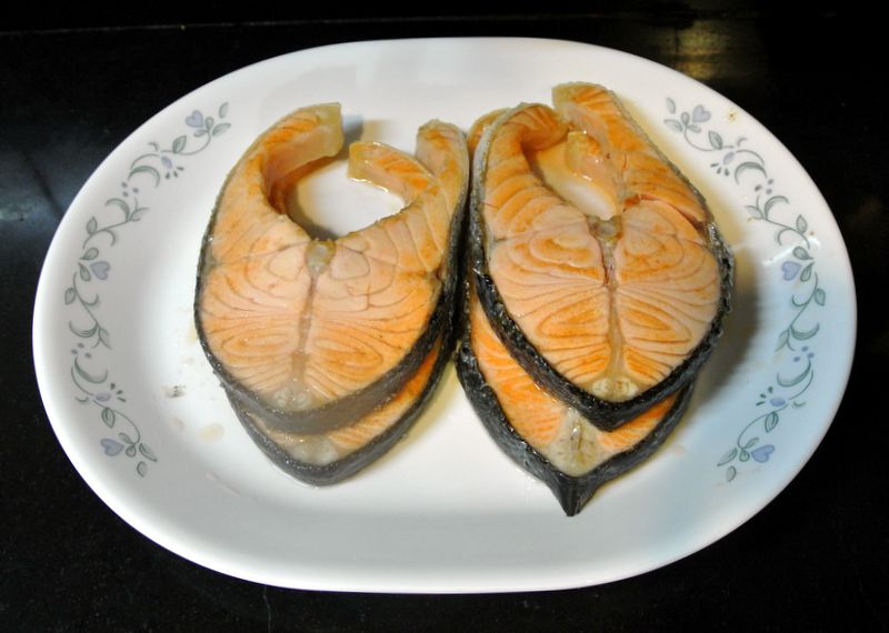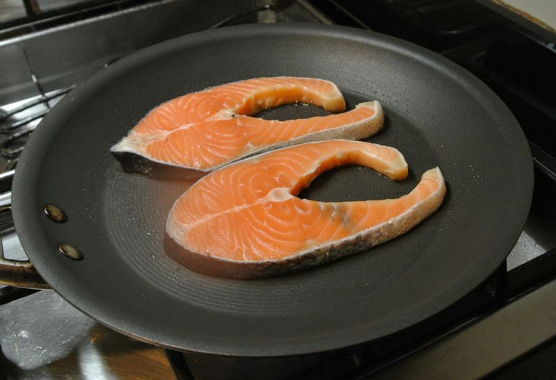 ไม่ต้องใส่น้ำมันเยอะเพราะปลาแซลมอนนี้มีไขมันเยอะ