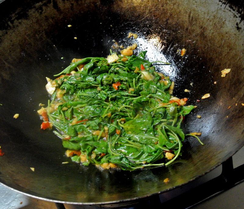 ตำพริกขี้หนูกระเทียมให้แหลกนำไปผัดในน้ำมัน