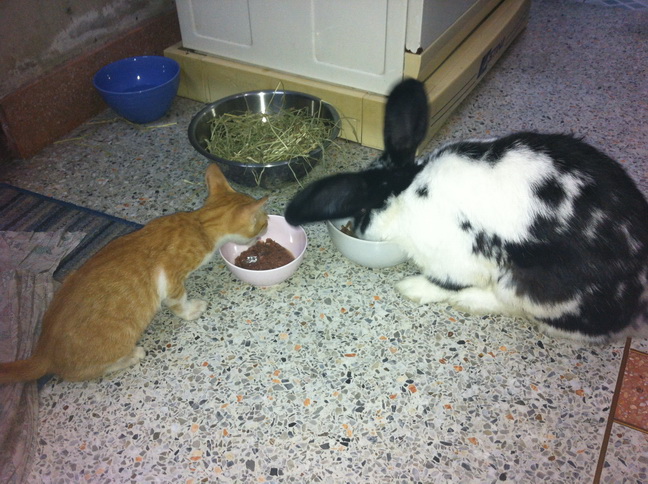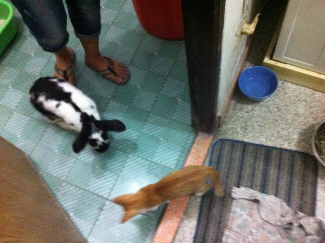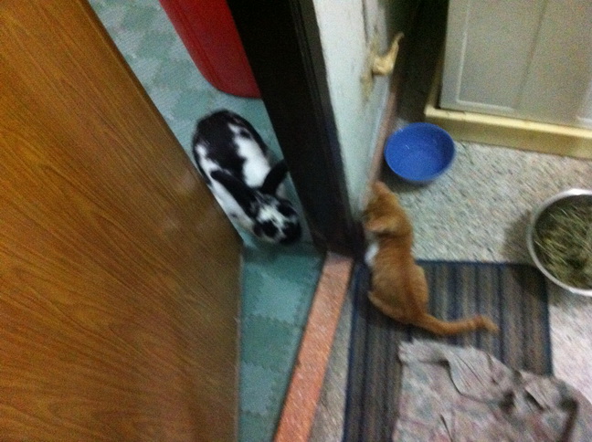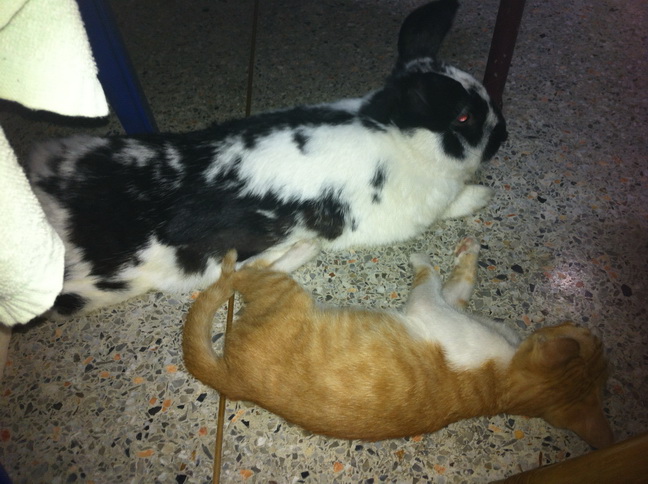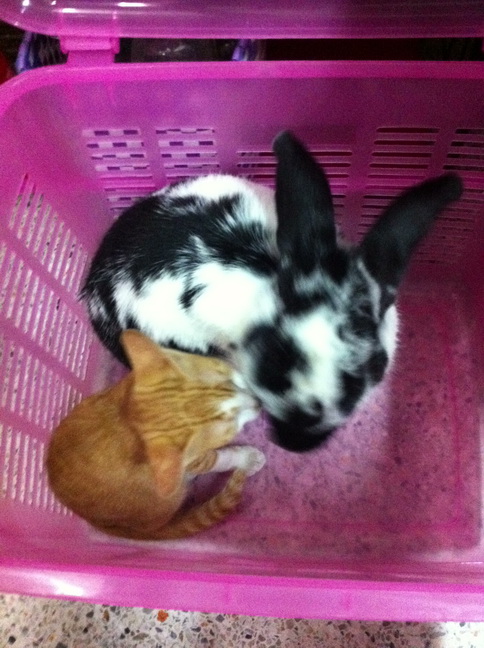 หลังๆเข้ากันได้ ขู่กันแค่ครั้งแรกที่เจอคือก่อนหน้าที่จะกลับปีใหม่ พอกลับมาปีใหม่เซเซืย์ขู่โนอาห์แค่ครั้งเดียวอีกวันก็นอนชิวๆ เล่นกัน ตัวนึงวิ่งนำตัวนึงวิ่งไล่ ตัวนึงกระโดดอีกตัวกระโดดตาม ตัวนึงยืนขออาหารอีกตัวร้องเรียกขออาหาร แสบคะ โนอาห์เค้าจะกินแล้วนอนชิวๆ (ผึ่งพุง) เซเซ์กินแล้วอยากเล่นก็จะแอบย่องเข้าไปตบก้นโนอาห์ พี่แกแค่หันมามองแล้วปล่อยให้เด็กน้อยเล่น ถ้ารำคาญมากๆก็เดินไปนอนที่อื่นแค่นั้นคะ บางวันมีเอาหัวถูๆกันโอาห์ถูกเซเซ์ก็ไม่หันหน้าหนี เซเซย์ถูกบ้างโนอาห์ก็ปล่อยให้ถู บางทีก็ไปงุงงิงๆกันให้ห้องน้ำ(ห้องน้ำจะวางกระบะทรายกับห้องน้ำกระต่ายไว้คะ) แล้วก็ออกมานอนกันต่อข้างนอก