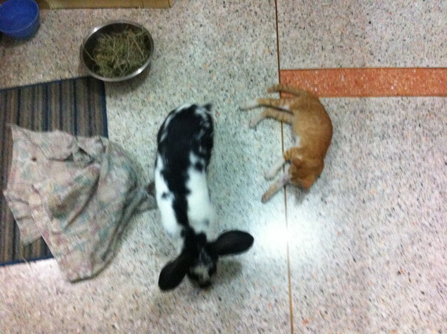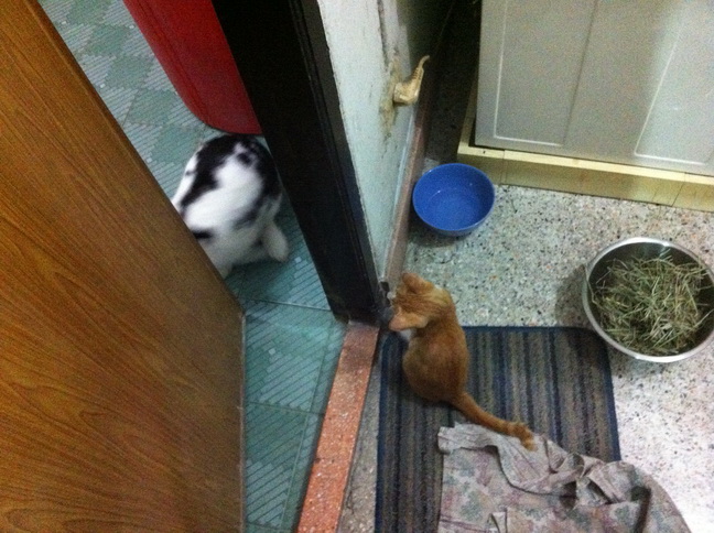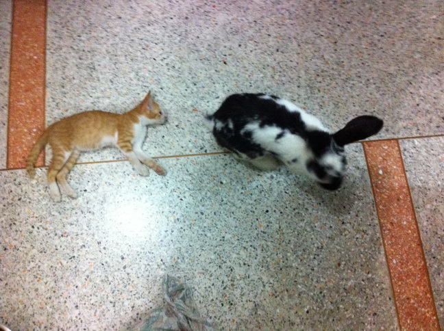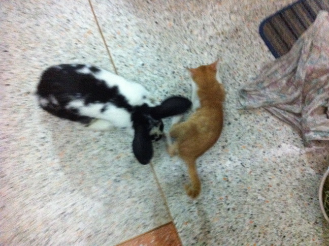 รูปนี้เป็นการเจอกันครั้งที่สองระหว่างแมวน้อยเซเซย์อายุจะสามเดือน กับลุงต่ายโนอาห์อายุอานามก็จะสามปี